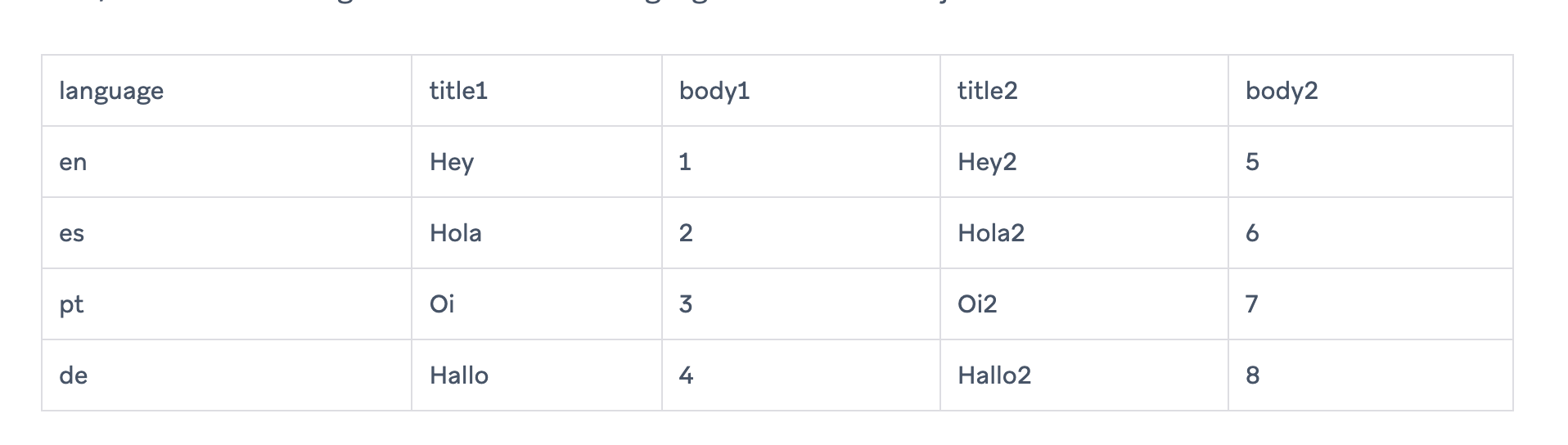 The first step is to set up the catalog in Braze with the email content that needs translation. The catalog must be formatted as shown above, using a standard ISO 639 language code as its ID (e.g., en, es, pt, de). Here's what you need to do: