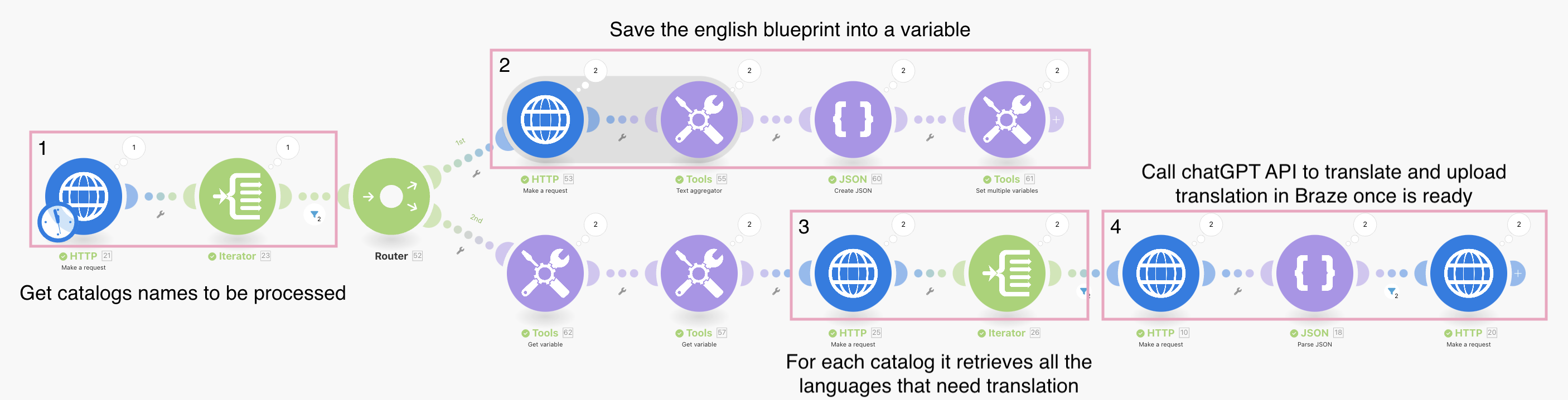 Here’s how I tackled it. I used Make.com to create automated workflows that leverage the APIs from both Braze and ChatGPT to automatically translate email content. While I used Make.com for this setup, it can be built using various other solutions (custom scripts, Zapier, n8n, etc.). In the steps below, I kept the explanation at a high level to avoid being tool-specific.